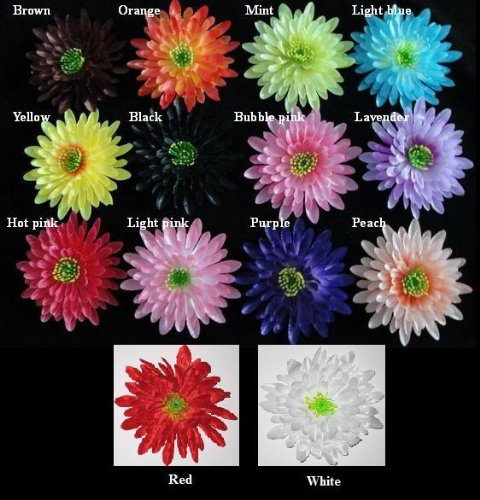 You will receive an assortment of (100) Silk Flower Heads, ranging from 2"-5.5". We have a ton of different styles of flowers: roses, gerbera daisies, spider daisies, mums, peonies, deconies, mini daisies, tropical lilies, icy roses, chiffon rosette flowers, and more!!! We include tons of rhinestone flowers, zebra flowers, etc.